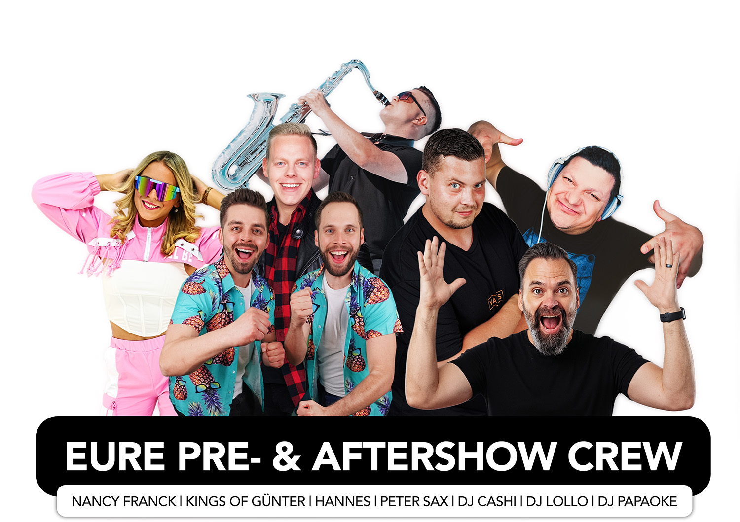 Das Künstlerprogramm für Pre- bzw. Aftershowparty am 27. + 28.11.2026 steht noch nicht final fest. Bereits bestätigte Acts: Peter Wackel, Nancy Franck, Kings of Günter, Hannes, Peter Sax, DJ Cashi, DJ Lollo & DJ Papaoke. Weitere Acts werden hier bekannt gegeben sobald sie feststehen.