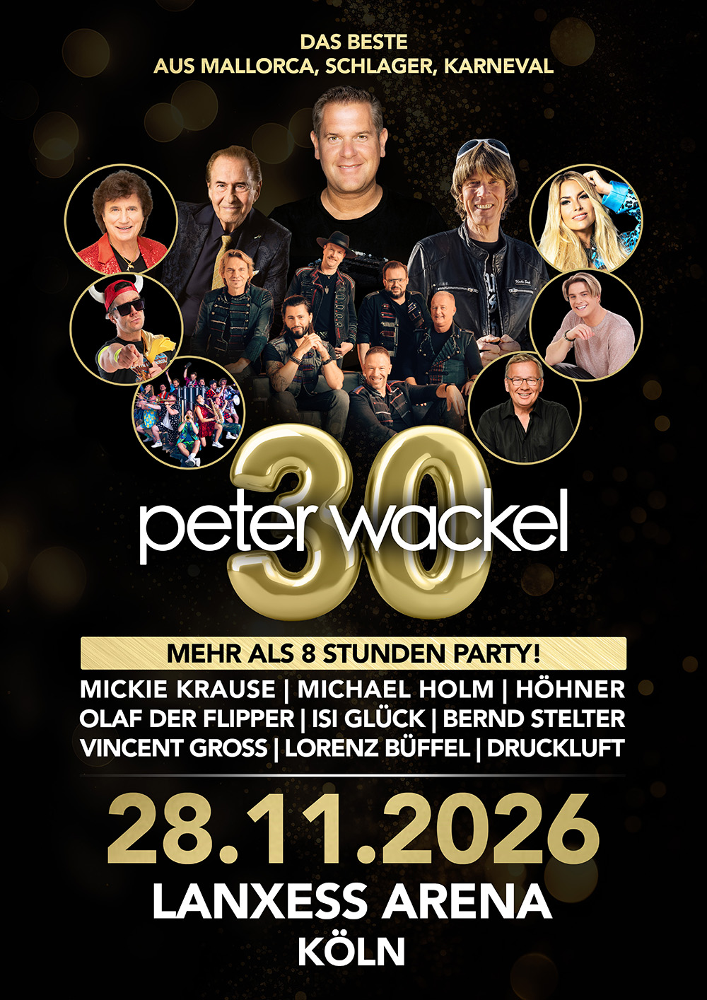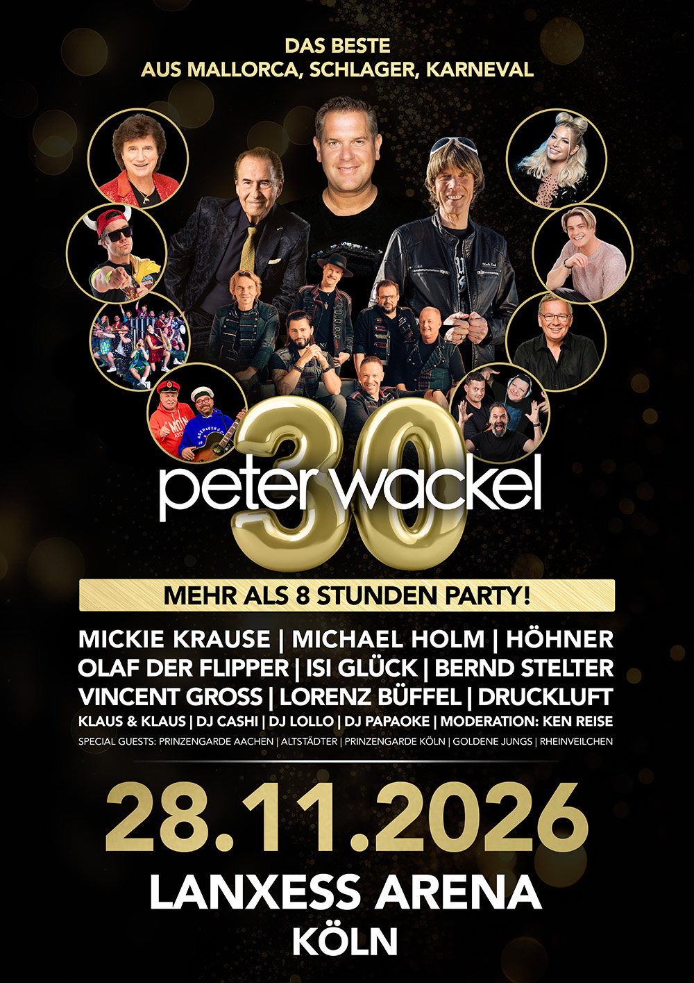 30 Jahre Peter Wackel und alle feiern mit! Das beste aus Mallorca, Schlager, Karneval erwartet euch, wenn um 15:11 die Pforten der Lanxess Arena aufgehen. Neben Peter Wackel mit Band werden viele Freunde und Weggefährten in der Arena für Partystimmung sorgen. Noch werden nicht alle Künstler verraten, aber ein paar Stars, die mit euch feiern werden, können wir an dieser Stelle schon raushauen: